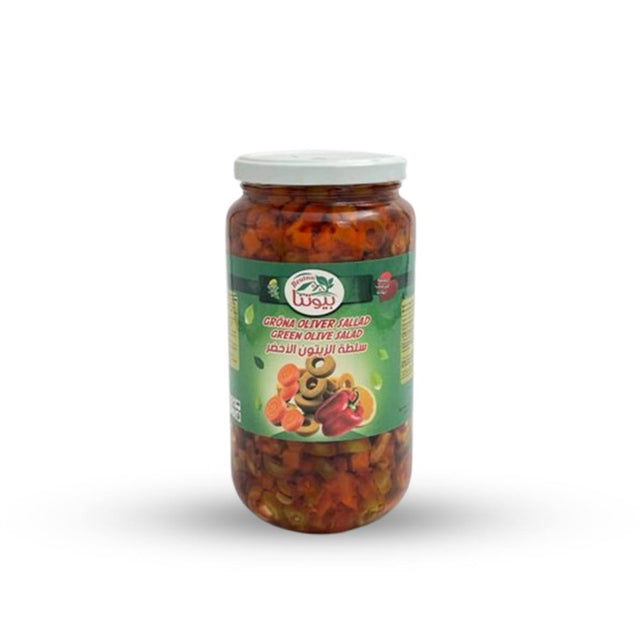 Ingredienser: Solrosolja, icke-hydrogenerad 31 %, gröna oliver (skärnade) 26 %, morötter 24 %, röd paprikapasta 9 %, citron 6 %, salt 3 %, tyren 1 %.